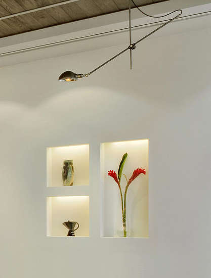 编辑点评:隔断睡眠区和衣帽间的蓝色半透明玻璃既起到了扩容的视觉效果,也让空间显得更开阔和通透。