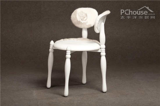 名师杰作:利用水曲柳、貂皮、白小牛皮等材质制作而成,造型源自很久以前的一把圆风椅,采用黑白皮草拼缝的玫瑰花图案,只是去掉两个扶手,改成两个靠背,酷似两只兔耳.加上曲线造型的椅腿,增添了几分高贵的气质。
