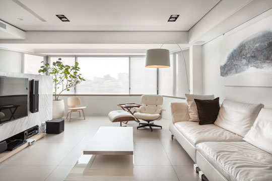 编辑点评:悬挂的电视机设计节省空间,与之相互呼应的是低矮的茶几,一高一低,增加空间的层次感和立体感。大理石电视背景墙分割空间又保持空间的完整性,墙底的挖空设计,增加了了空间的收纳功能。