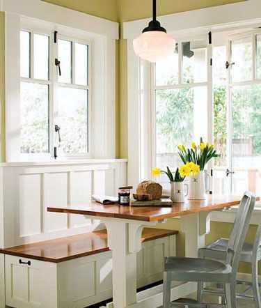 把小餐桌靠墙而放,节省了不少空间。草绿色的餐桌底布和带大花朵图案的餐桌布相搭配,营造出了浓浓的田园气息。
