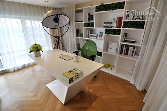 书房与卧室同在二层,书柜设计的灵感来自荷兰画家孟德里安的作品,造型独特的书桌和落地灯,这些经过精心选择的家具和家饰都是书房里独一无二的装饰亮点。