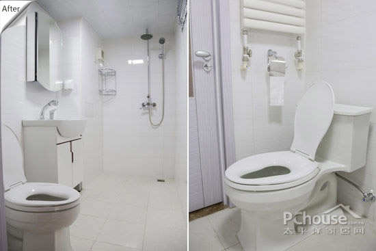 白色主色调的卫浴间,完全符合了淘淘的装修需求,墙面和地面都是白色的瓷砖,白色和银色的卫浴洁具,合理地安放在卫浴的每一个角落。
