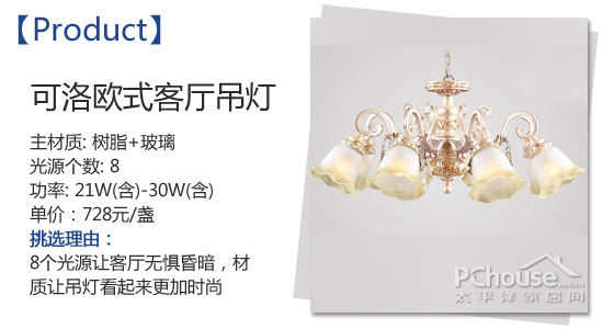 可洛欧式客厅吊灯:树脂+玻璃,8个光源,欧式风格灯具, 21W(含)-30W(含)功率,728元/盏。【点击了解产品详情>> 】
