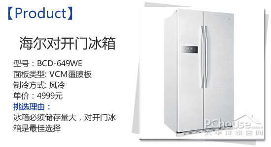 海尔BCD-649We对开门冰箱:908×818×1790mm,风冷制冷方式,1.22Kwh/24h的耗电量,4999元/台。【点击了解产品详情>> 】