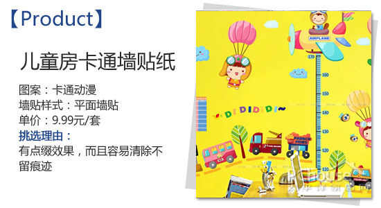 儿童房卡通身高墙贴纸:平面墙贴,卡通动漫,9.99元/套。【点击了解产品详情>> 】