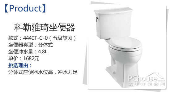 科勒雅琦4440T坐便器:4440T-C-0(五级旋风),分体式坐便器,4.8L坐便冲水量,400mm最小坑距,1682元/个。【点击了解产品详情>> 】