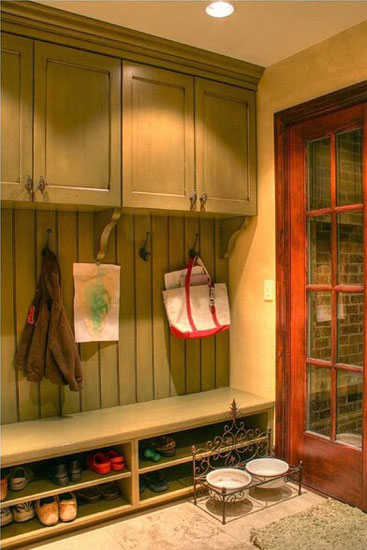 做旧的玄关空间,草绿色一体式玄关柜在暖色调灯光的照射下显得尤为怀旧,在狭长形的换鞋凳下方是长形鞋柜,背景墙上的挂钩也能够挂放不少常用的东西,顶部的吊柜更是突显出大容量的收纳性。