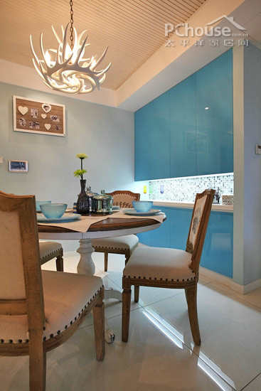 设计说明:餐边柜采用上下柜结合的设计,表面铺满天蓝色的反光玻璃。中间镂空带状以蓝跳色马赛克砖砌成,通过光带营造晶莹通透之感,为就餐区带来一片清凉。