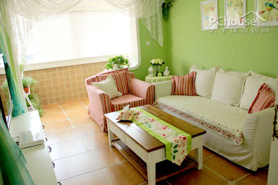 设计说明:通过与业主的沟通,结合业主对色彩的接受程度,设计师在墙面上运用大量的清新绿。翠绿的色彩映射在整个居室,满眼尽是清凉。