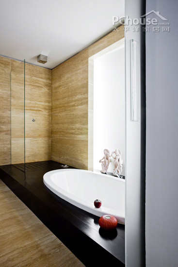 设计说明:能想象木色的设计能放在卫浴么?设计师通过巧妙的手法,把原木色应用到卫浴墙面上,与黑白时尚的浴缸是相反的风格,原始与现代时尚的结合,品味独到。