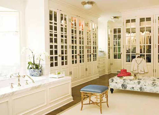 编辑点评:这是安静舒适的加州住宅,大型的开放的穿衣间毗邻洗浴室。让它如此像阁楼不得不说是一种不寻常的创意。但是我们有足够的空间实现它,房间面积有500平方英尺。法式门让房间闪光,蓝色的波斯亚麻茸毛座椅来自泰勒装饰。