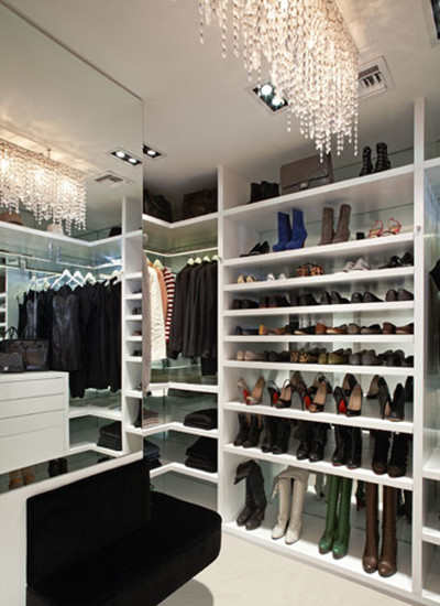 编辑点评:高端的,奢华橱柜设计师创造了一个小型的却又高贵的衣橱给乔和他的妻子。她的目标是确保我的客户感觉到他们就是在自家的小店购物一样。枝形吊灯来自于米洛提。