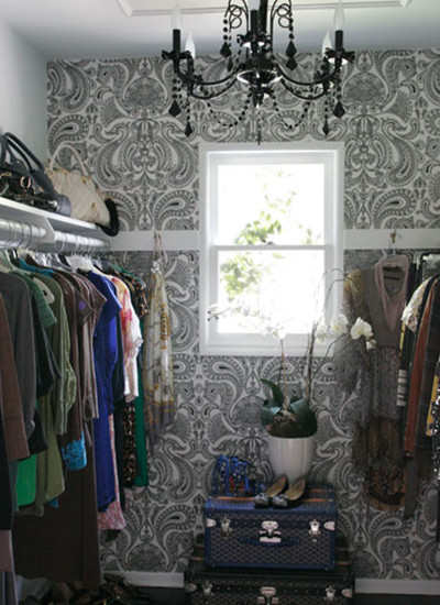 编辑点评:在一间农庄式别墅里,设计师艾琳想让壁橱成为一种宣言。“我挂起有图像的黑白墙纸在墙上,因为壁橱的墙经常被盖住,天花板就成了最显眼的。我加入了装饰好的嵌线,并把黑色玻璃的枝形吊灯挂了起来。戈雅树干正好为物品摆放提供了一个新的展台——我喜欢它就像我喜欢那双鞋还有植物一样。”