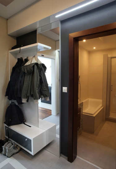 编辑点评:尽管空间不大,但仅凭一面墙,设计师也将它打造成多功能的空间,即有鞋柜、又有了挂衣钩,还立起一面全身镜。