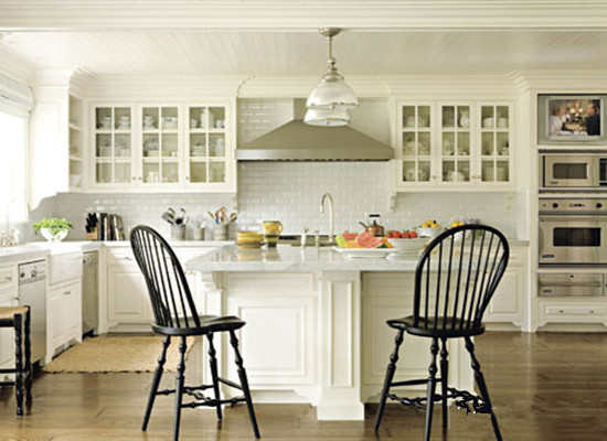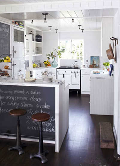 编辑点评:这个加州海滩住宅的主人之一因为找到了合适的创意而着迷不已。他把房间的布置传到了古董家具网。设计师爱伦·马丁在早餐吧里增加了一只小黑板,为的是引人注意。石南花陶瓷生产的地铁式瓷砖,让业主联想到贝壳。双子座天花板灯具来自阿尔法,整个房间的涂料是本杰明摩尔的“山顶白雪”。
