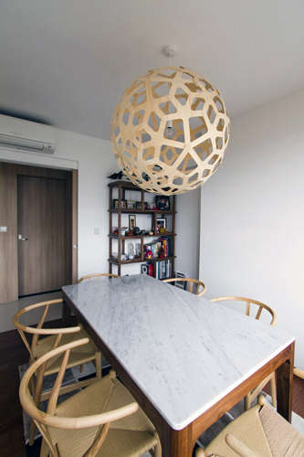 编辑点评:公寓餐桌处的设计依旧符合公寓的一贯风格,米色的藤椅以及木身大理石桌面的餐桌,此外餐桌上方的吊灯也是一大亮点,独特的造型犹如一个笼子将灯泡包围在其中。