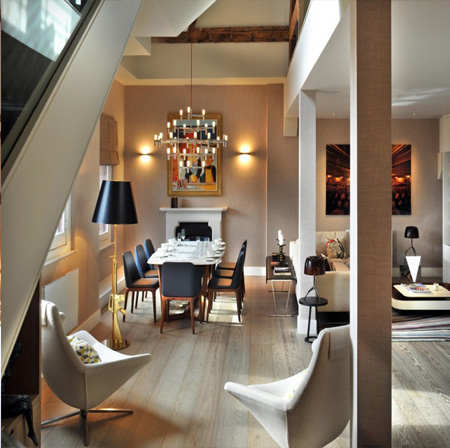 编辑点评:这间顶楼公寓设计上不愧是“麻雀虽小,五脏俱全”,何以见得?除了中部大小沙发的搭配得以满足待客需求,用餐区里,餐桌也是为多人用餐准备的,可见这并不只是一间温馨的小屋。灯饰上,大吊灯与壁灯也为用餐区营造了舒适的氛围。同时,设计师也充分利用空间,在此处安置了休息椅,让主人放后得以在此闲聊。将休息椅围在此处,也是空间的软隔断。