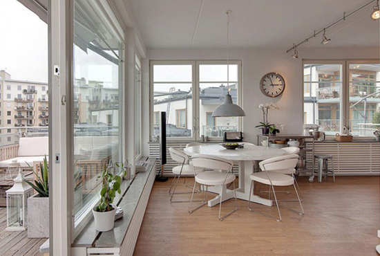 编辑点评:在全方位的落地窗的映衬下,小小的餐厅不仅采光好,而且看起来开阔明亮,整体白色的餐桌和餐椅让这份明亮贯穿到底。