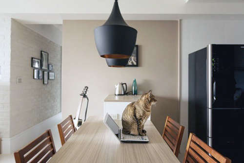 编辑点评:房屋不大,因此选用开放式的厨房更能节省空间。从这个角度看去,房柱的阻隔仿佛将这个空间一分为二,外加上餐桌的放置,整个空间被完美的划分成三块。
