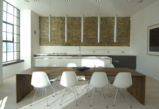 编辑点评:白色概念的餐椅与木材质地的餐桌相搭配,这是传统风格与时尚元素的结合,给人一种简约而又静谧的感觉。同时与厨房相映衬,显得对称和谐。