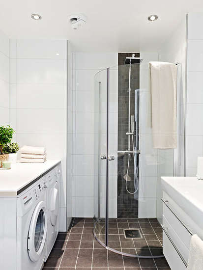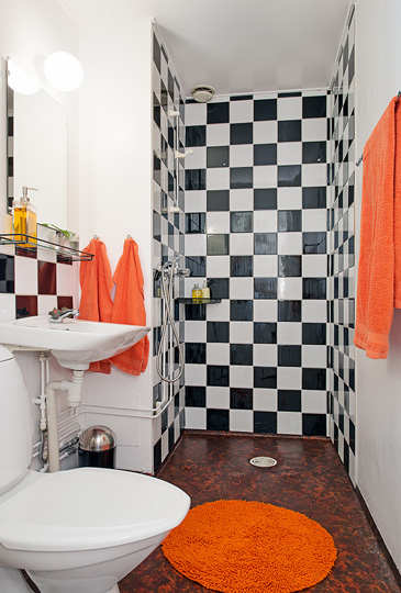 编辑点评:浴室的设计,最大的创意在于利用墙体凹进去的特点,把沐浴区设计在凹墙处,进一步发展了强大的收纳功能。另外在沐浴区外面铺上一块深橙色的地毯,用于沐浴后擦干脚,这样人不容易滑倒,充满人性化。