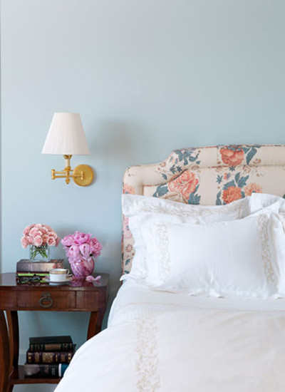 编辑点评:Allison Caccoma给这间主人卧室的墙上用了高光淡蓝色。设计师想要这间康涅狄格的别墅抓住长岛的美,和水面的波光闪闪。“我喜欢一点光,”她说“我觉得房间里的光,即使很弱,也会让人愉快。颜色是Benjamin Moore的 Harbor Haze , 同样给传统的花顶板新的感觉。
