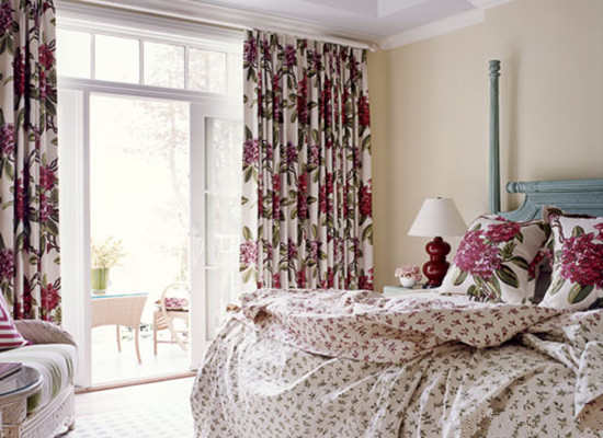 编辑点评:这里是非常显眼的装饰——威斯康辛的湖边别墅用的是非常夸张的花图案印刷。“这样大规模的图案我们一般用在戏剧上,”设计师Carleton Varney说。“上面有大朵图案,让人很愉快,”正反两用被子是Carleton V's Rossway 使用了两种色彩设计——柔和的红色和绿色。印刷的淡草绿色Lisle顶板来自Ficks Reed。淡黄色墙纸来自Farrow & Ball,中心的Alexis 台灯来自Pottery Barn。
