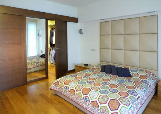 编辑点评:落地镜安装在衣服储藏间的门边,即可作为衣帽间的门又可作全身镜。床头柔软的靠背,使得主人在床上看电视时更为舒适。