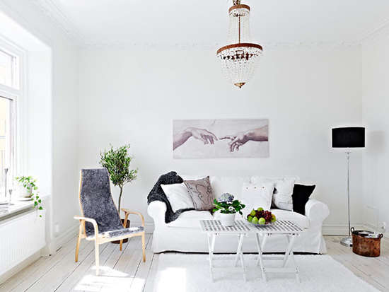 编辑点评:白色的墙面、沙发、地毯构成了整个空间纯净无暇的底色,与零星点缀的跳跃色彩形成了有趣的对比,构建了一个奇妙的视觉空间。另外,灯笼形的吊灯显得格外晶莹,给简约的客厅带来一种沉静感。