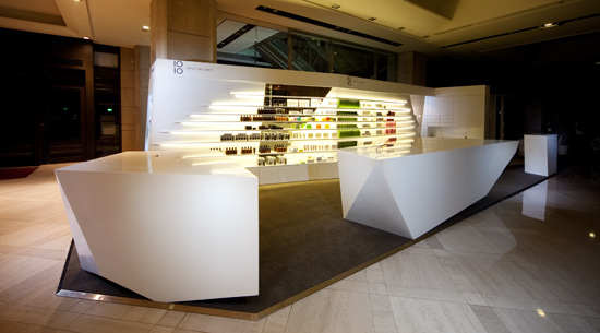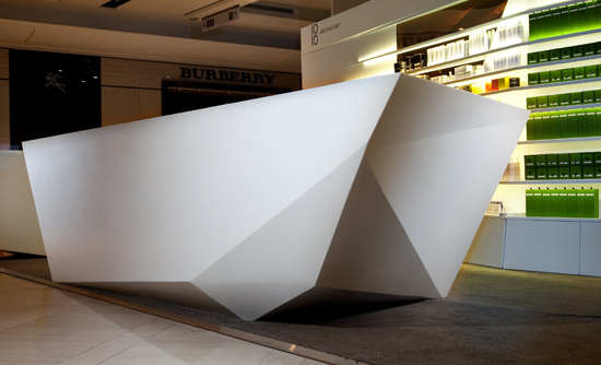 【太平洋家居网 设计频道】本篇为设计师为Apothecary药妆店打造的开放式专柜空间,以白色人造石切割的几何柜体造型,能从不同方向看见相异的形貌,结合拯救消逝冰山的环保概念,制作出大型冰山的视觉观感,在简约俐落的设计中坚持美学细节体现。