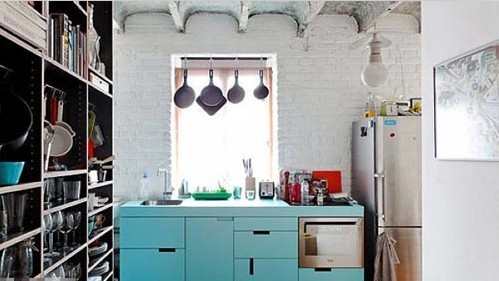 蓝色给人一种清新的舒适之感,给炎热的夏天带来丝丝的凉意。在这个小厨房中,隐藏着强大的收纳功能,大大的搁架设计,将锅碗瓢盆全都收入其中。