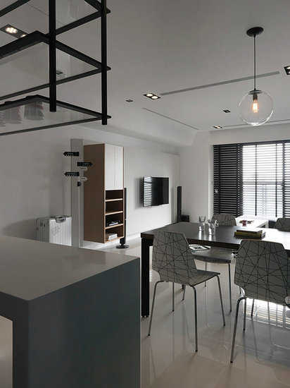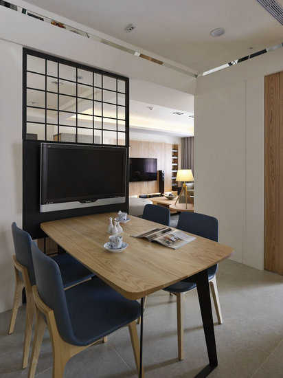 编辑点评:餐厅、和室与厨房的开放规划,让姊妹欢聚的场所有更开阔的互动交流。设计师利用铁件屏风背面吊挂电视,让设计绝对不仅只单一机能。