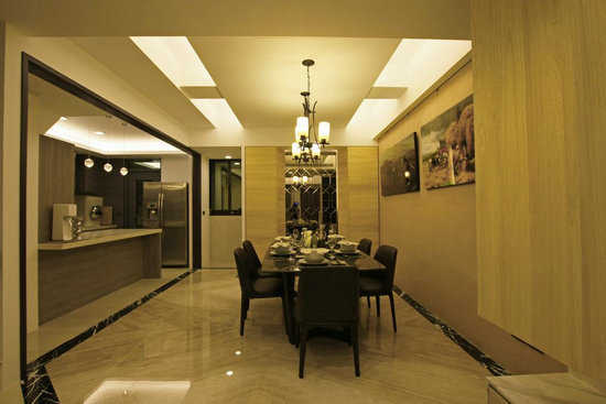编辑点评:承袭客厅电表箱的立面处理,餐厅段落运用同样手法做出主墙面,搭配两侧对称性高柜,确立主题性的风格画面。