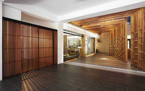 编辑点评: 远凝建筑本体,南方松水墙涓流、倾泄出水上步道的清凉,红柳安角材格栅穿透做出门面一致性铺排。