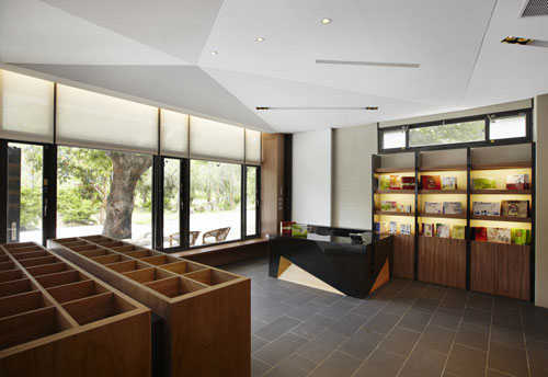 编辑点评:空间的运用上,前端落地玻璃划分出恒温空调的包装区,为了让近百种的形象包装清楚展列,格栅与层板横向交织,柜面上则透过木作打斜,分类出各式包装袋摆放及收纳。