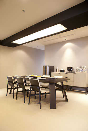 编辑点评:迎合着第二代朝向自有品牌的经营梦想,设计师以擅长的天花板折迭,变化出五角椎立体感,几何语汇点出世代交替使命。
