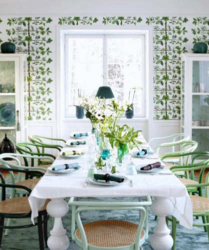 圆润的餐桌和椅子设计让整个空间都是优雅的代名词。如果将墙面都刷上绿色也许就太过张扬了,所以不妨将墙面的色彩改成绿色和白色相容的样式。同时透过的纱质窗帘也在无形中增加了不少的情调。