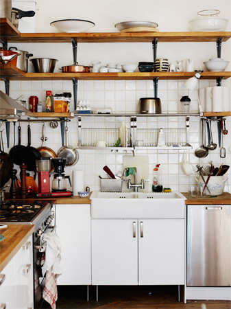 编辑点评:厨房不大,但利用角落收纳是重要的设计点之一;把厨具架起,留出更多的操作台空间,让整个台面保持洁净整齐。