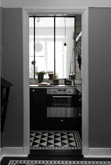 编辑点评:从厨房狭窄的门可以看出厨房的空间并不大,但是得益于内置式烤箱和其他厨具,厨房显得干净整洁。厨房地板采用与玄关一样的地板,既简约美观,又方便清理。