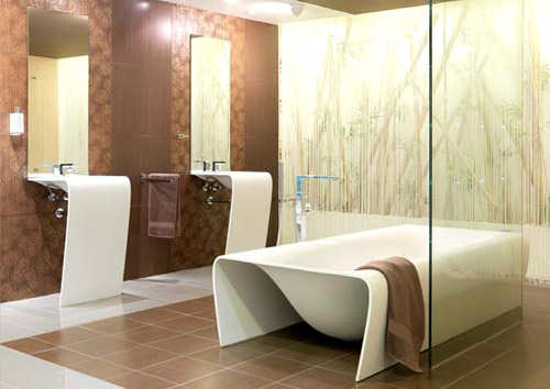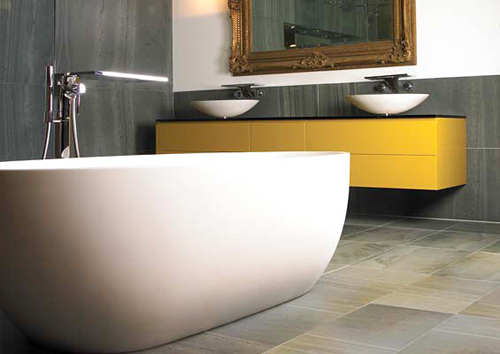 Aquamass公司邀请的两名设计师为其设计的浴缸也都使用了这种材料,它给予了产品柔软的造型和坚固的质量。其中由Michael Bouquillon设计的Strip浴缸,其侧面好似翅膀一样摺叠着,仿佛是纸或织物变化而成;而Paolo Chipiron为该公司设计的Stone One浴缸成为了最好卖的单品,它的形状像一个很深的碗,并附有多种表面材质可供选择,例如人造革、山羊皮或锦缎,或者人造蛇纹、牛皮纹、鳄鱼纹或斑马纹。而其他的材质诸如Quarrycast,它生产出的浴缸相当坚固,同时又很轻便,触感光滑;常用到的还有超薄树脂材质,表面光滑,充满美感之余,还便于运输安装;而名为Cian的材料则非常耐用持久,并且防刮防污。这些新型材质的运用可以赋予现代浴缸精雕细刻的外观,将浴室衬托得更为优雅。这在设计师Tarrington看来,浴室因此“少了许多病房气息,这非常重要,因为现代的室内设计经常把浴室与卧房合并在一起”。
