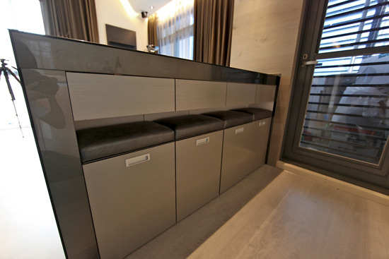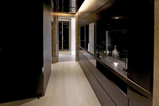 编辑点评:玄关处与过道结合在一起,为充分利用这个空间,设计师在整体上将其结合成小型展区,内嵌的展品在黑色墙壁与玻璃的衬托出散发金属质感,一副高冷气质尽显于此。