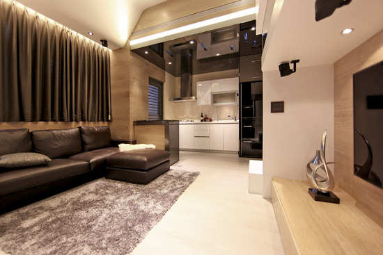 编辑点评:客厅与厨房同属一个空间,可伸缩桌台在这时候便扮演了隔断的角色,既提供了用餐场所,又有效地区分出客厅与厨房,可谓一举两得。