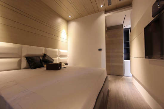 编辑点评:沿着工作平台的楼梯内侧,来到了卧室空间。黑白灰基调饰以暖感光,单色木质天花板辅以利落线条,床头的立体凸块装点不失时尚趣味的简约风格。