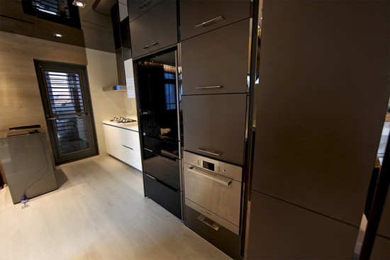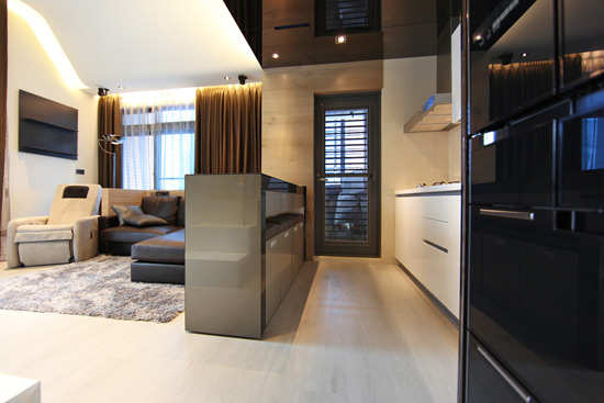 编辑点评:设计师根据地形,在过道左手边设计成整体厨房的格局,黑色厨房设施与玄关搭配,显得和谐而统一。