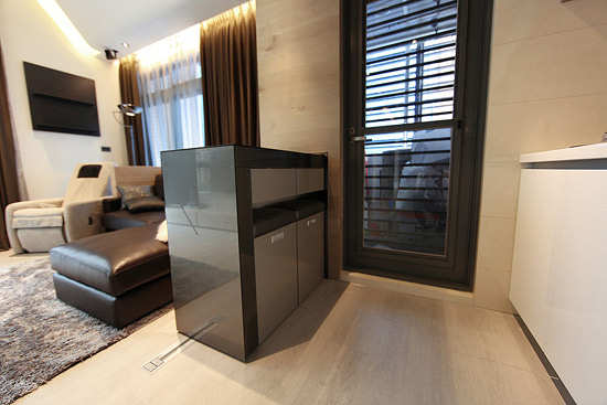 编辑点评:在有限的厨房空间里,设计师将桌台内嵌进了墙壁里,当业主需要用到桌台的时候,只需要将其拉出来即可!