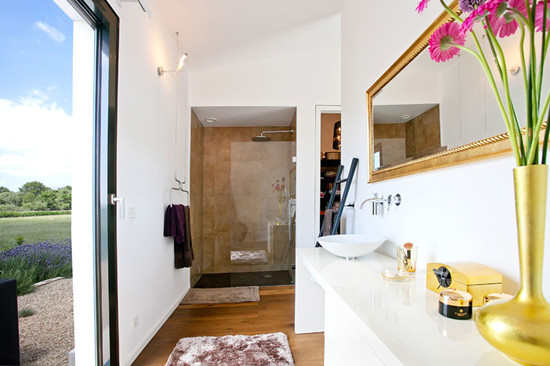 编辑点评:卫浴延袭一贯的简洁风,但是两个小小的壁灯,又令这个简单的洗手间更添趣味;壁灯刚好正对两个小窗户,共同增加卫浴的光亮度。