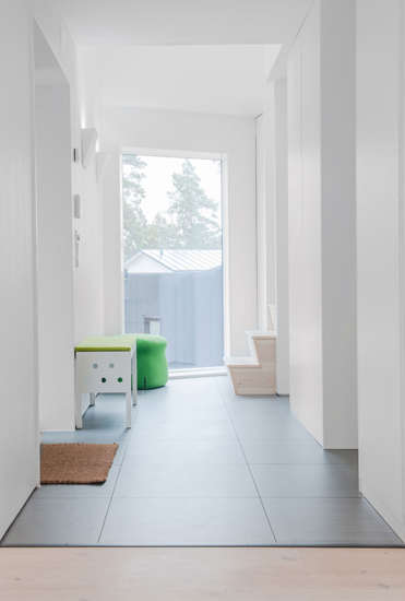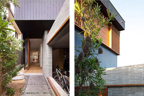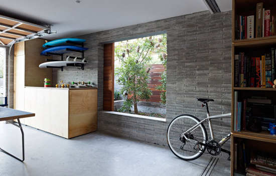 编辑点评:简单却不失美观的石板小路和室内木地板自然过渡;镂空墙壁使玄关与车库相通,方便自行车的存取,同时也让狭长的玄关空间更加开阔。