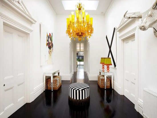 编辑点评:木框玻璃门设计从视觉上使室内外空间相连,而且方便自然光的透入。走在黑白条纹的地毯上就像踩着黑白钢琴键一样,让人心情愉悦,与桌子的黄色支架和楼梯级搭配在一起,使玄关处充满线条美。