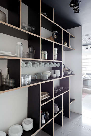 编辑点评:一堵窄长的墙壁作为隔断墙划出了储物柜所在的收纳空间,大小不一的格子满足了不同物品的摆放。融入墙壁的储物架不仅美化了玄关空间,更为餐具等物品提供了充裕的收纳与展示空间。