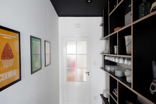 编辑点评:白色木门与墙壁自然融合,利用压花玻璃代替透明玻璃作为木门的装饰,既美观和保证有光线透入又保护了室内的隐私,一举多得。黑色天花让墙壁与天花有分层的错觉,立体感骤增。